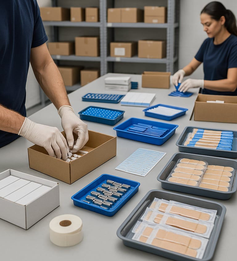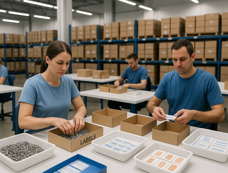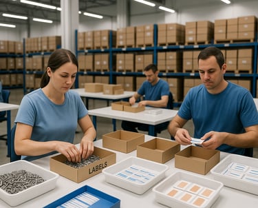 Lavoriamo con minuteria, cancelleria, cerotti, piccoli componenti tecnici e articoli che richiedono un confezionamento manuale o un assemblaggio attento ai dettagli.
